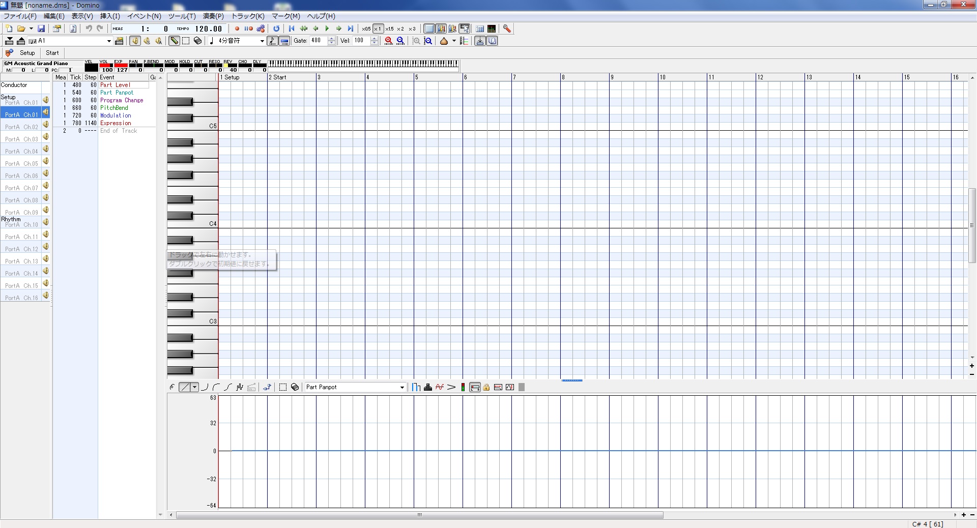 「世界樹」でのノートの打ち込みは、Dominoの時と同じく、ピアノロール画面のマス目上でダブルクリックする事で行えます。