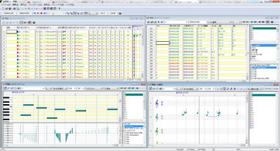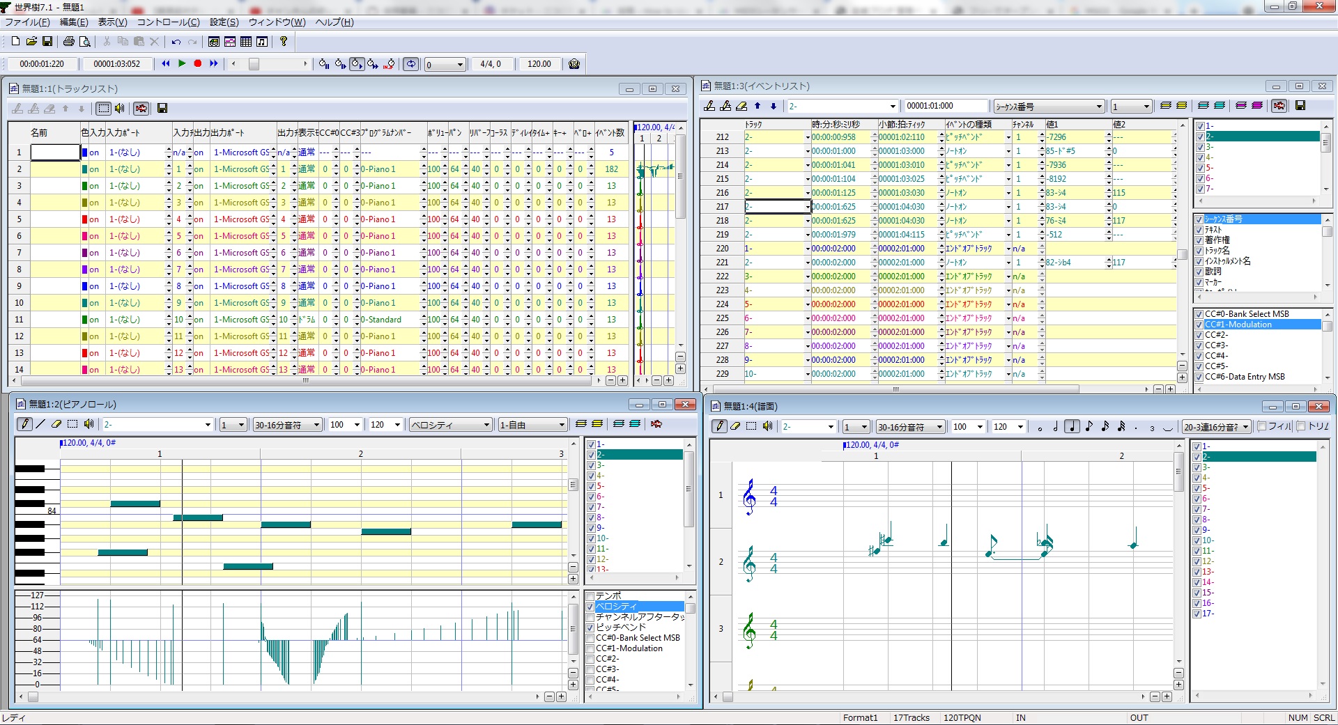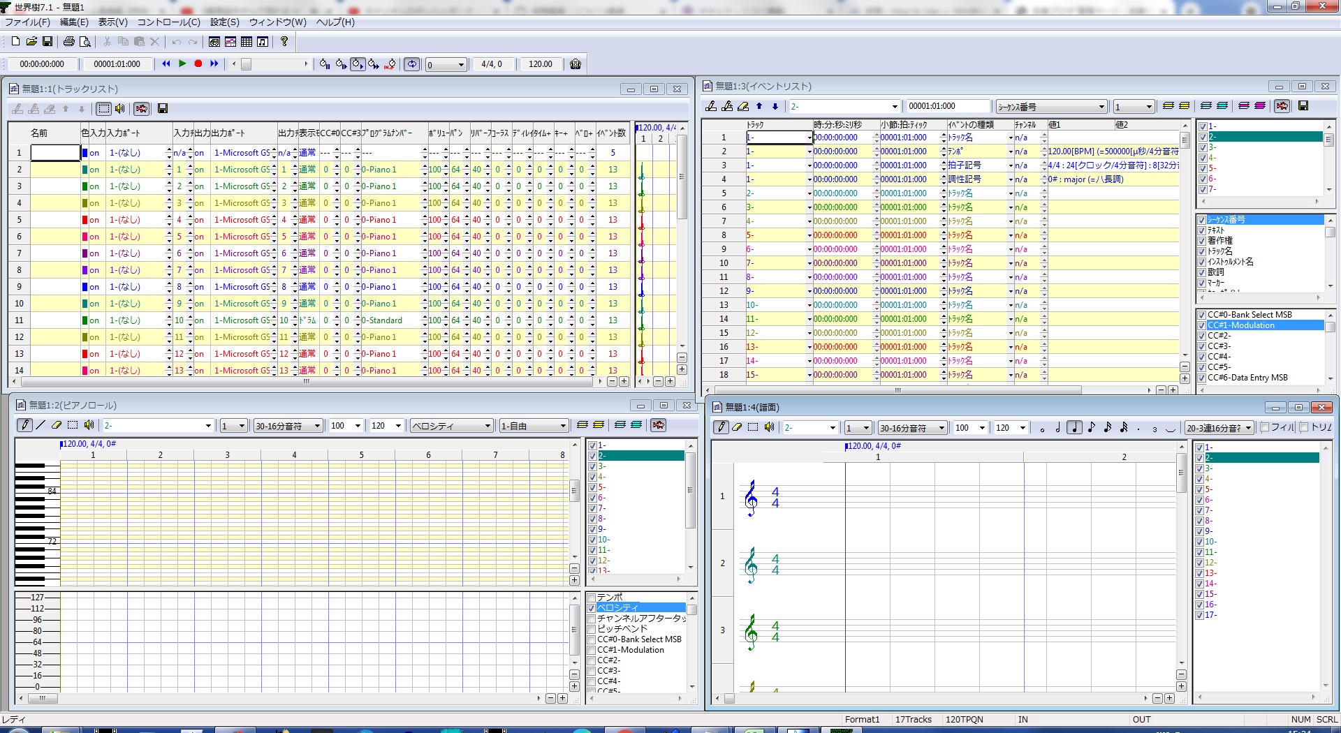 「世界樹」では、トラックの設定を行う画面と、ピアノロール画面、イベントリストの画面、そして、楽譜の画面の四つの画面で打ち込み作業や設定などを行う事が可能となっています。